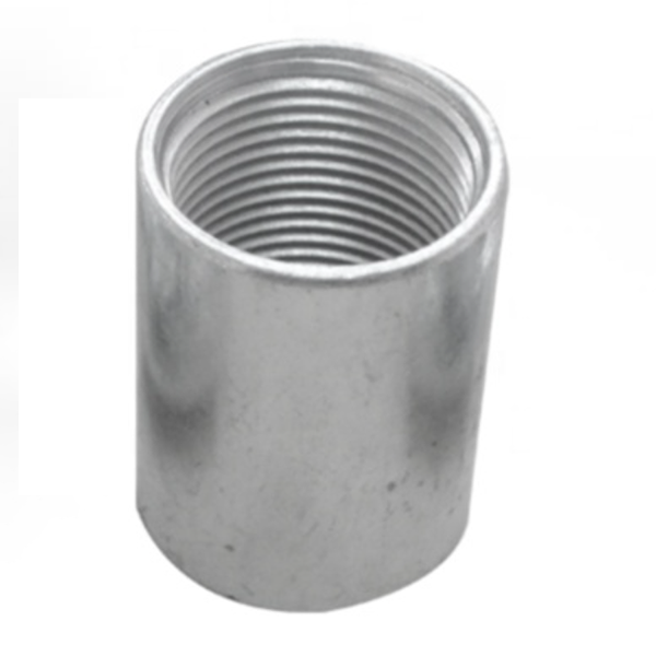 Galvanized rigid conduit coupling manufactured from seamless steel pipes, used for joining two lengths of threaded rigid conduits together, extending the length of the conduit pipe.